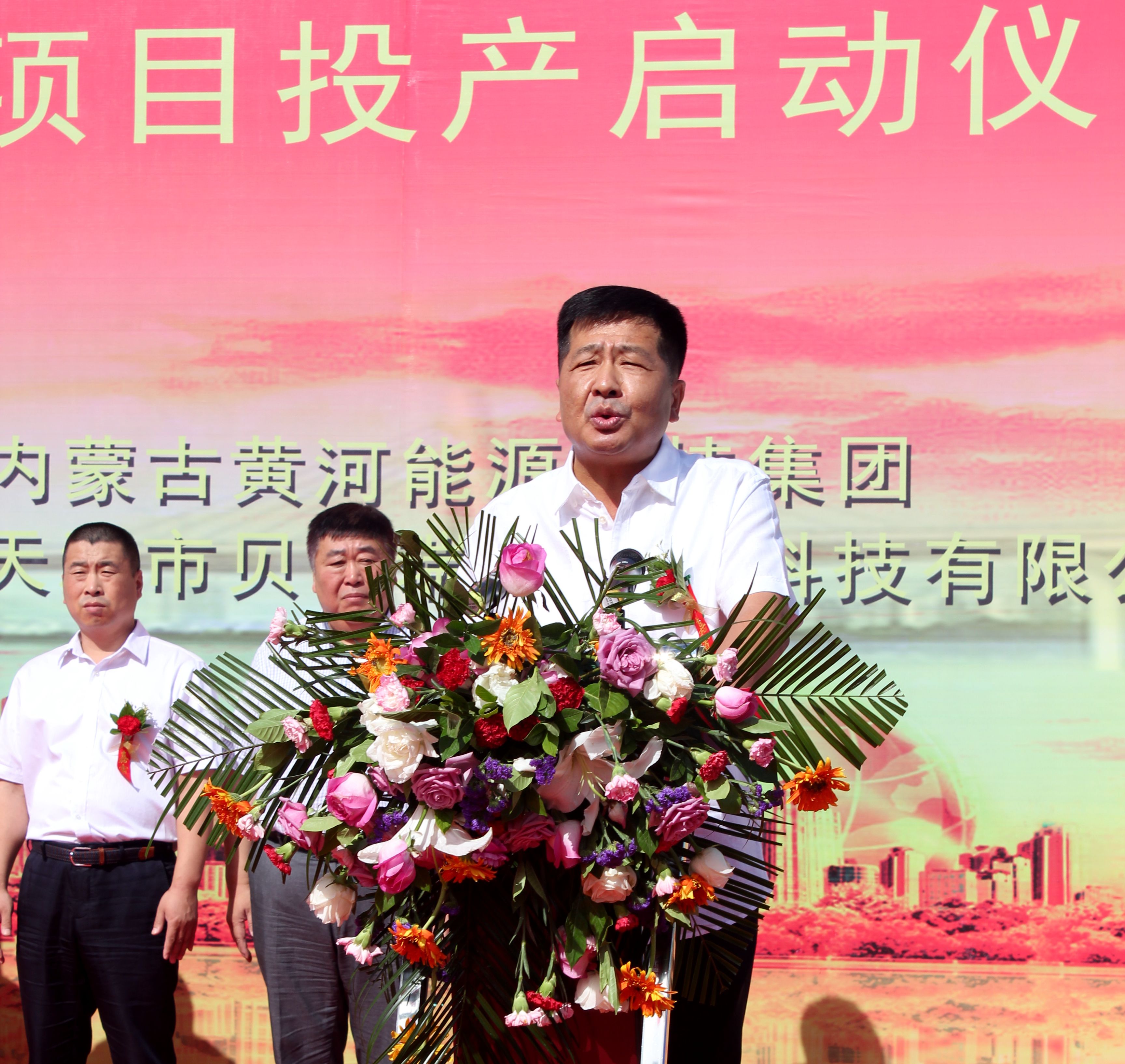 出席项目投产仪式的市、区领导有:乌海市委常委、海勃湾区委书记刘春,市委常委、政府副市长刘俊山,海勃湾区常委、政府副区长吴红顺,海勃湾区千里山工业园区管委会主任赵根,海勃湾区政府副区长杨庆远以及海区有关部门领导。
