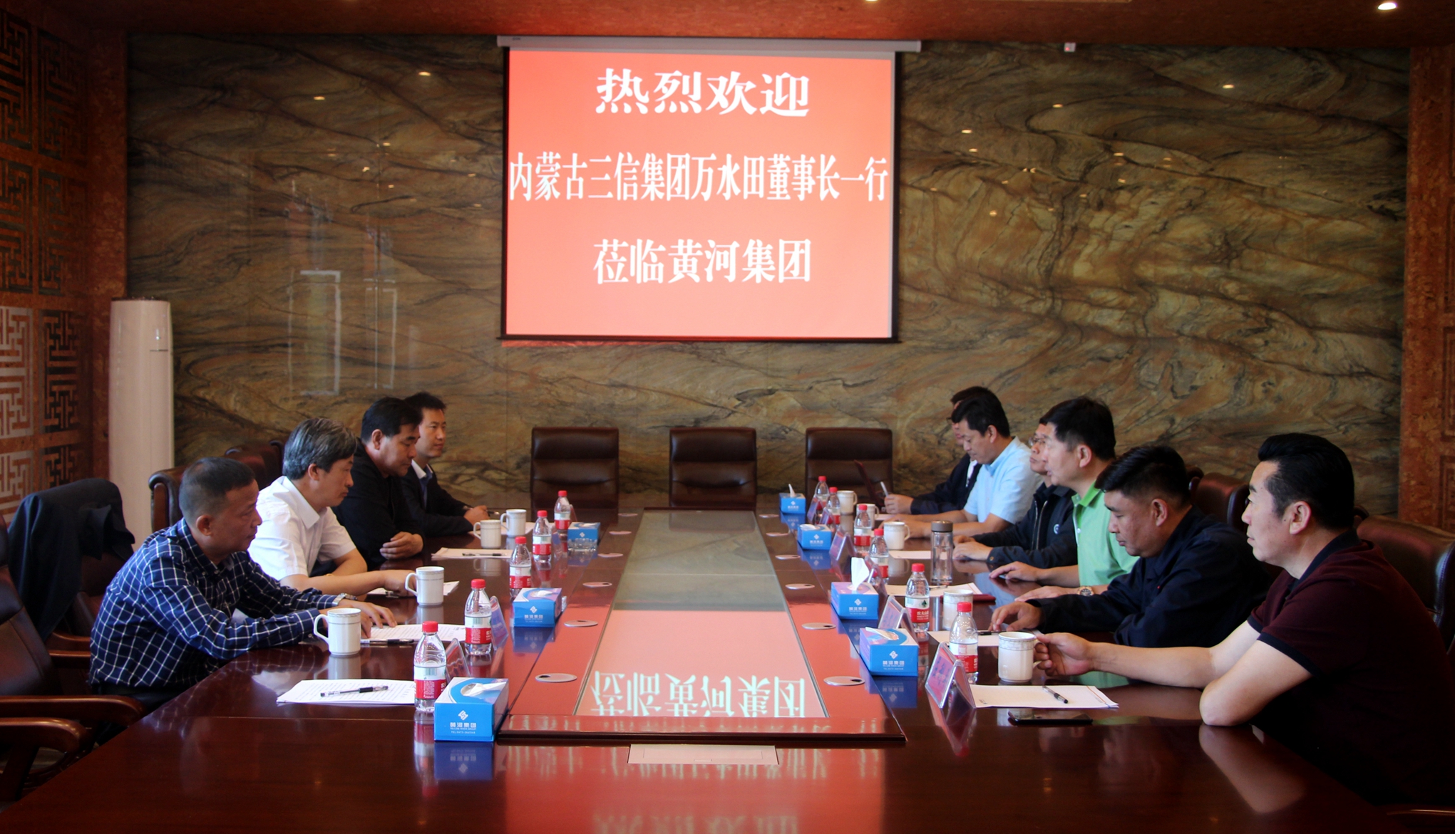 2018年9月8日,内蒙古三信实业有限公司董事长万水田一行莅临黄河集团参观考察,双方就进一步加强了解、寻求合作等方面,进行座谈交流。集团董事长马文义,集团副总经理马文华等领导陪同考察。