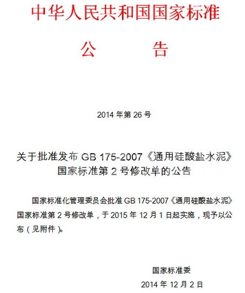 12月10日,国家标准化管理委员会官网公布:关于批准发布GB175-2007《通用硅酸盐水泥》国家标准第2号修改单的公告,修改单主要内容是取消32.5复合硅酸盐水泥。于2015年12月1日起正式实施。