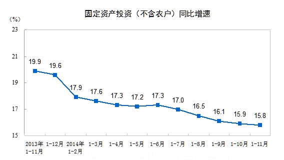 2014年1-11月份,全国固定资产投资(不含农户)451068亿元,同比名义增长15.8%,增速比1-10月份回落0.1个百分点。从环比速度看,11月份固定资产投资(不含农户)增长1.02%。