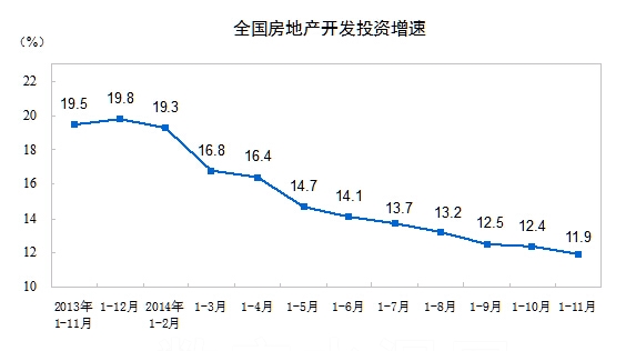 2014年1-11月份,全国房地产开发投资86601亿元,同比名义增长11.9%,增速比1-10月份回落0.5个百分点。其中,住宅投资58676亿元,增长10.5%,增速回落0.6个百分点。住宅投资占房地产开发投资的比重为67.8%。